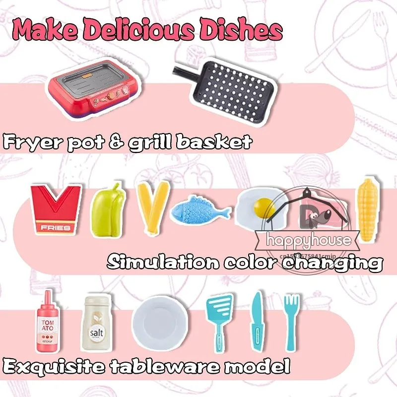 How To Play – First, you need to put the ice & cold water into the cooking box. When you turn on the switch, the water will out of the hole with “Gulu-Gulu” sound. Put in the food and seasonings you want to eat, wait for the food to cook (Color Changing), then pull it on a plate. You can start enjoying the delicious meal you have made. Toy kitchen playset stimulates your child’s creative thinking and also improves their social skills.