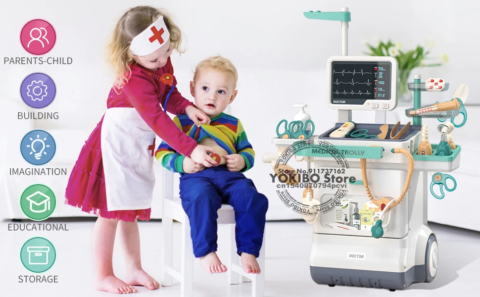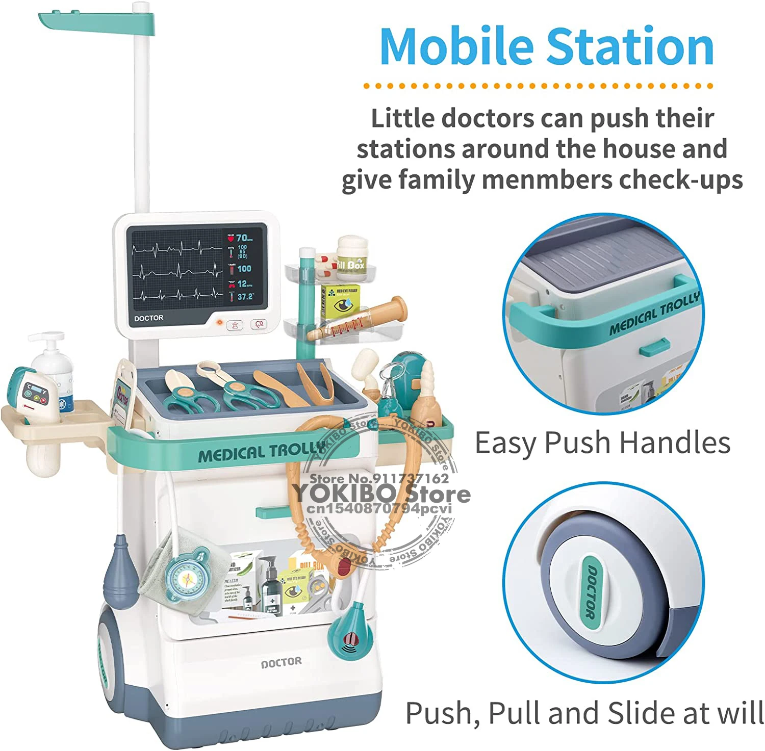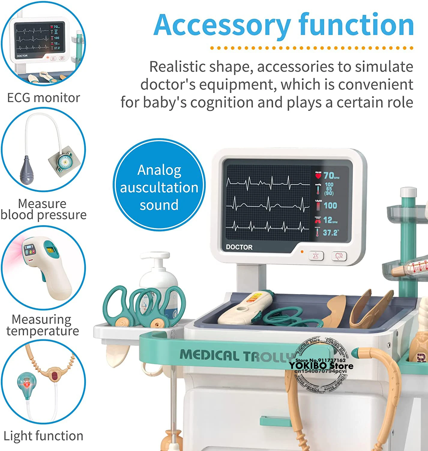 【Multi-purpose doctor cart】Children can do "medical check-ups" for family members or friends through a wheeled medical cart. Storage counter and oversized locker for all accessories. Cultivate children to develop good storage habits during play, but also can learn medical and health knowledge.