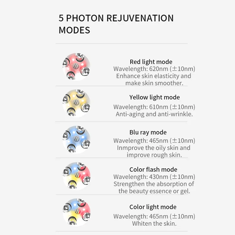 - 5 LED Phototherapy Modes: Tailored solutions to relieve various skin concerns, enhancing your natural radiance.