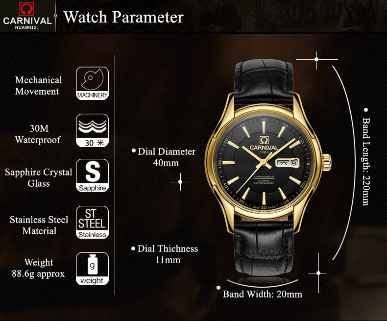 CARNIVAL Mechanical Business Watch for Men Brand Luxury Sapphire Glass Automatic Wrist Watch Men’s Waterproof Clock Reloj Hombre