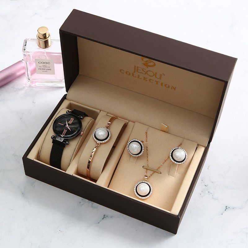 “Indulge in light luxury with our Ladies Quartz Watch—a waterproof fashion statement in a charming bracelet five-piece gift set.