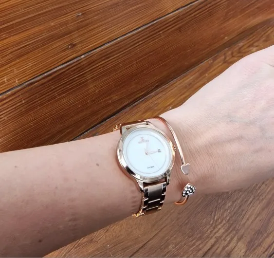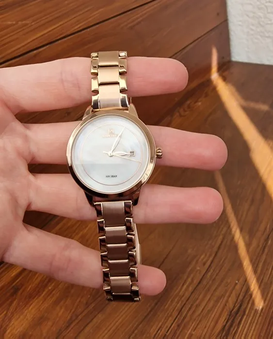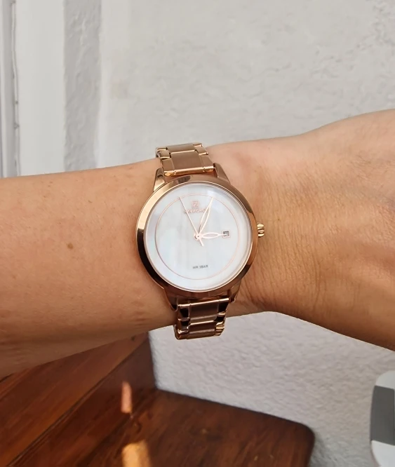 Very cute and elegant (I am a little small hand man). Gifts are appreciated (comes a tool to adjust the size of the Watch, a bracelet and a cloth to clean the watch)
