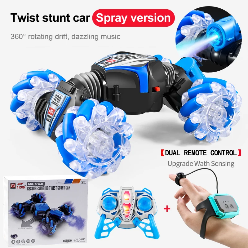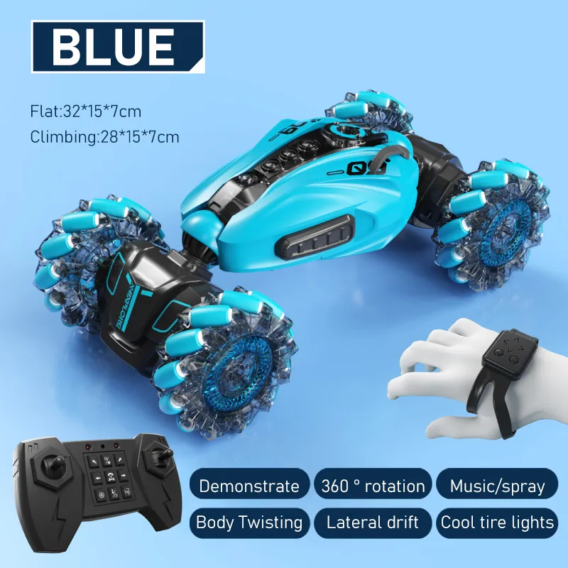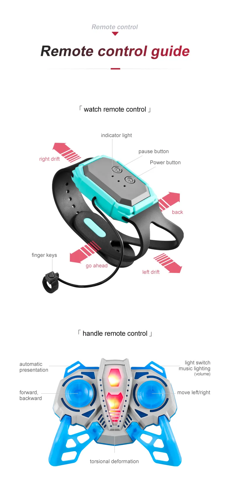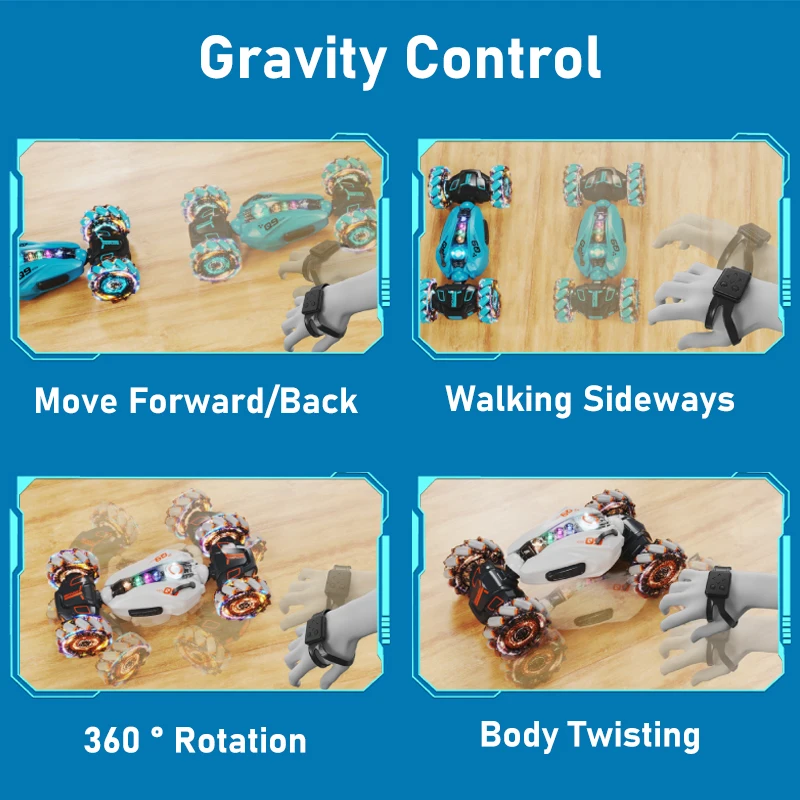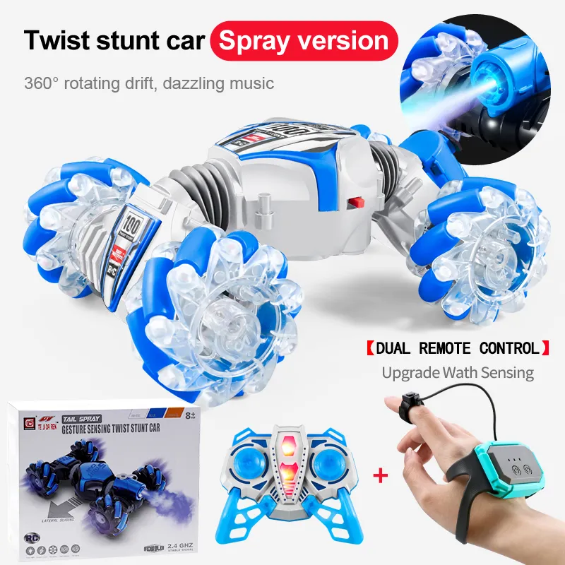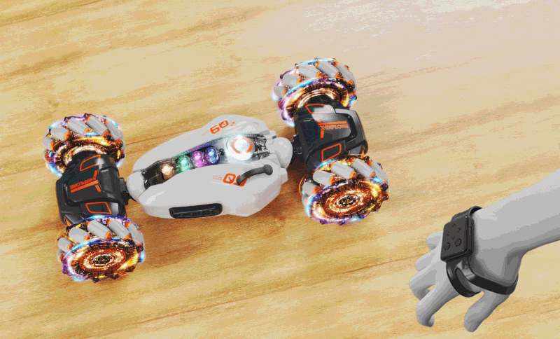 Gesture Sensing Twist and Remote Control. You can gesture control stunt twist car. You just need to wear a gesture-sensing watch and give a gesture, and the remote control car will act accordingly. Or you can control it directly via the remote control.(The two kinds of remote can not turn on at the same time)