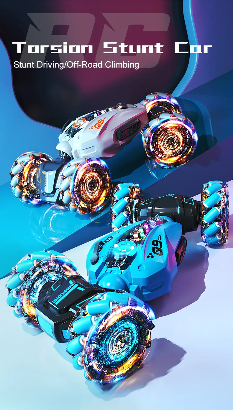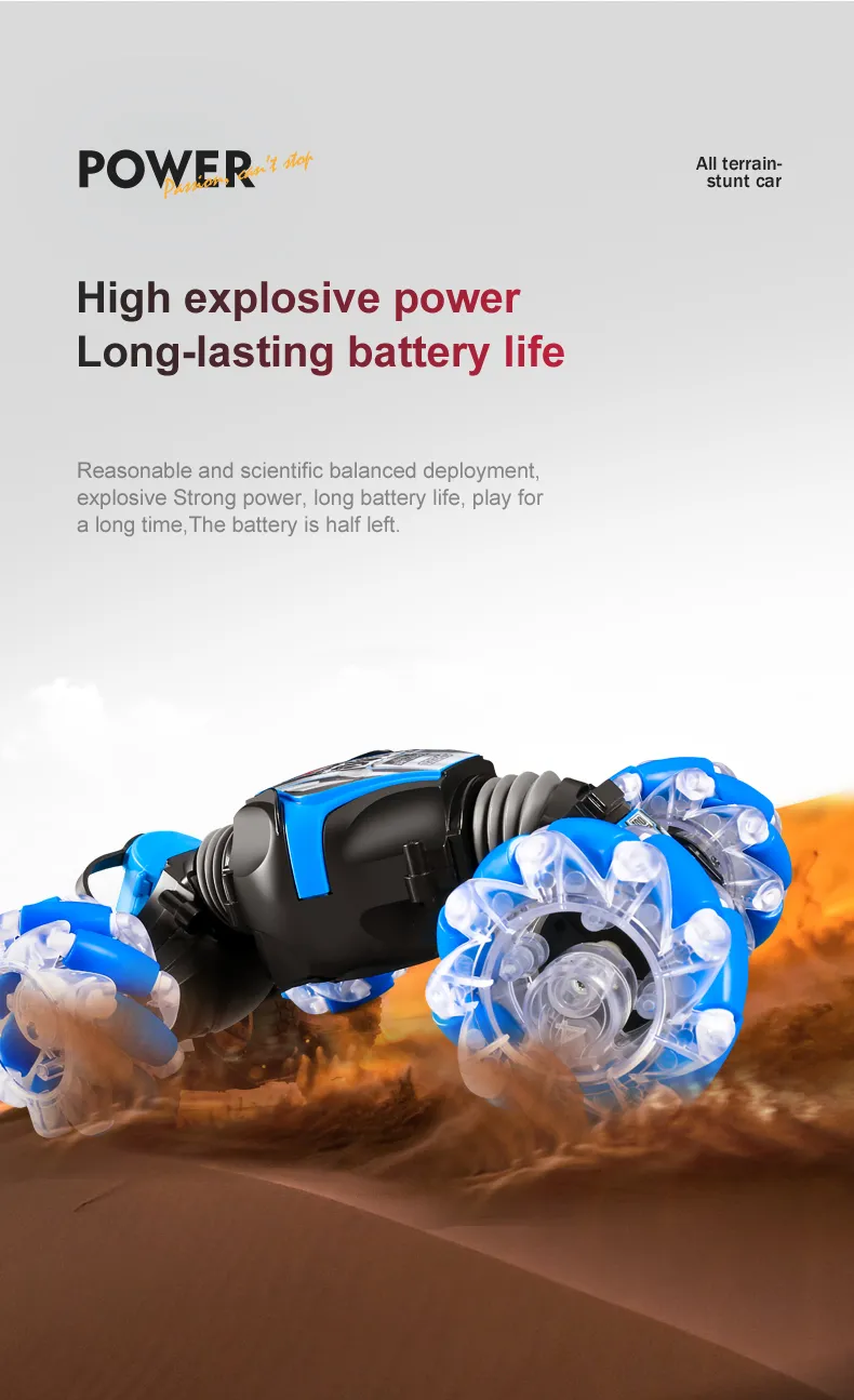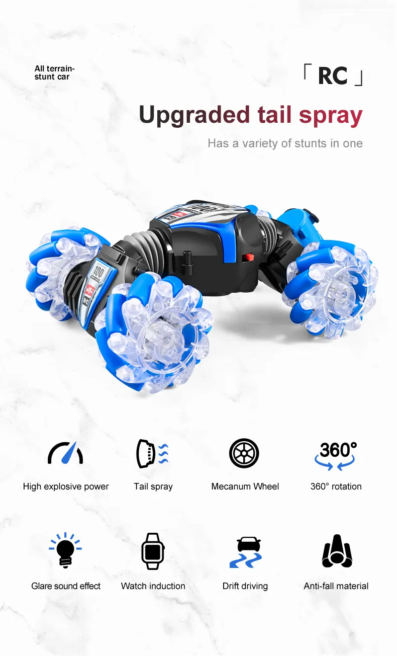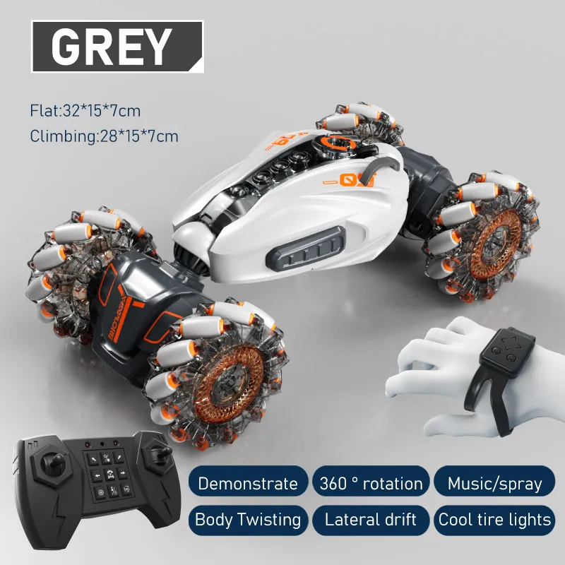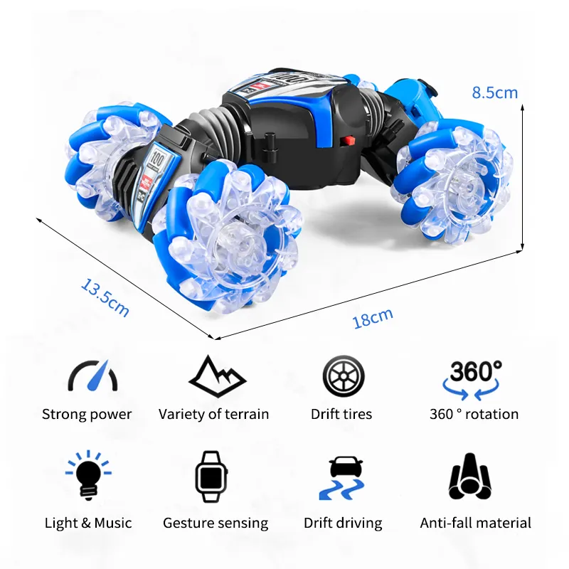 Gesture Sensing Twist and Remote Control. You can gesture control stunt twist car. You just need to wear a gesture-sensing watch and give a gesture, and the remote control car will act accordingly. Or you can control it directly via the remote control.(The two kinds of remote can not turn on at the same time)
