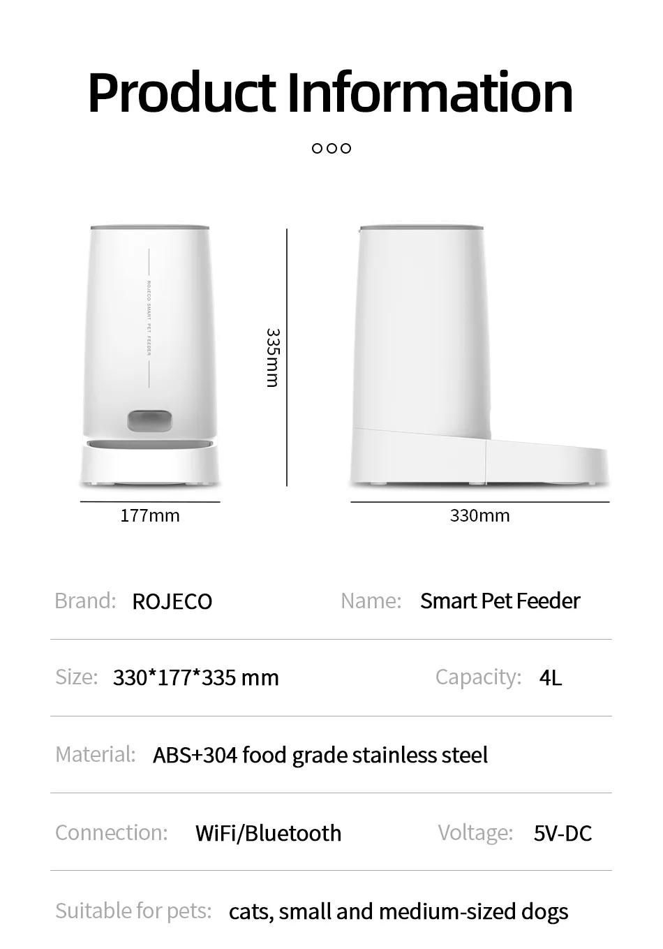 ROJECO 4L Automatic Pet Feeder Cat Food Dispenser Accessories Remote Control Smart WiFi Auto Feeder for Cats Dogs